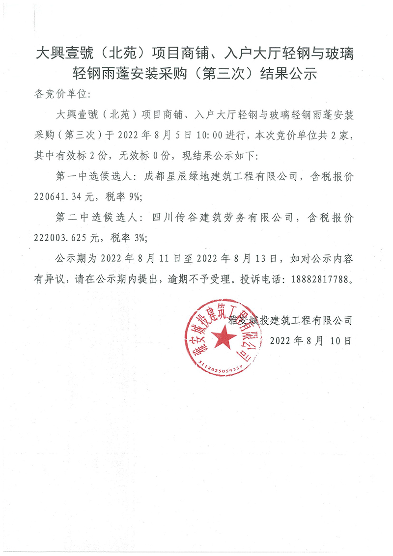 大興壹號(北苑)項(xiàng)目商鋪、入戶大廳輕鋼與玻璃輕鋼雨蓬安裝采購(第三次)結(jié)果公示