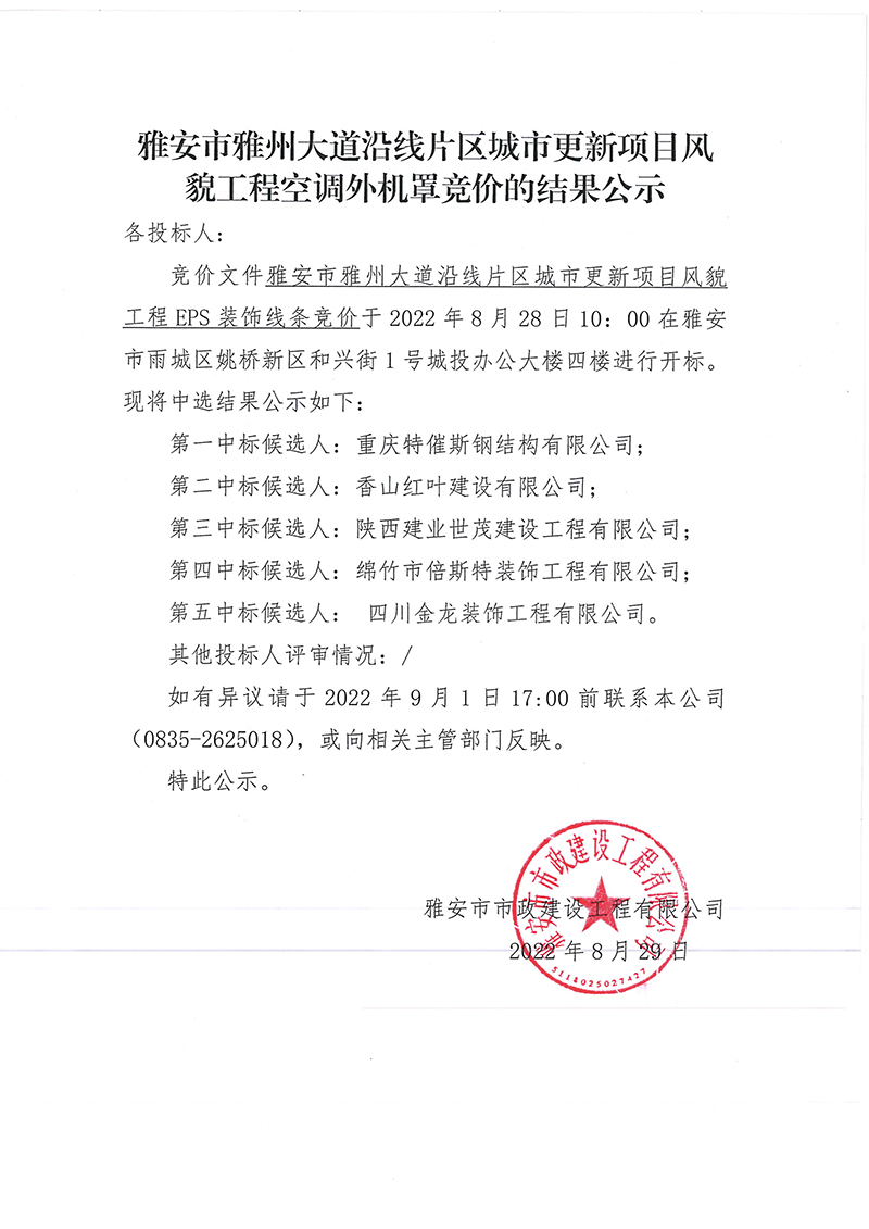 雅安市雅州大道沿線(xiàn)片區(qū)城市更新項(xiàng)目風(fēng)貌工程空調(diào)外機(jī)罩競(jìng)價(jià)的結(jié)果公示