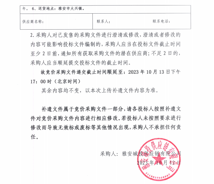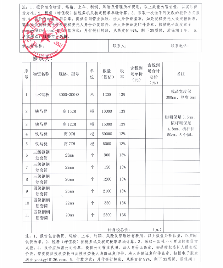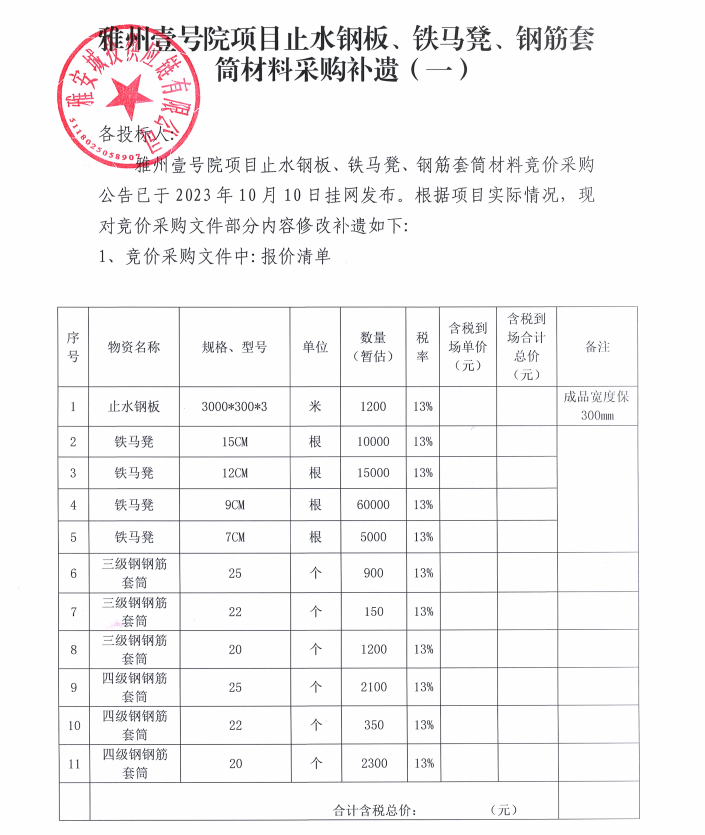 雅州壹號院項目止水鋼板、鐵馬凳、鋼筋套筒材料采購補遺(一)