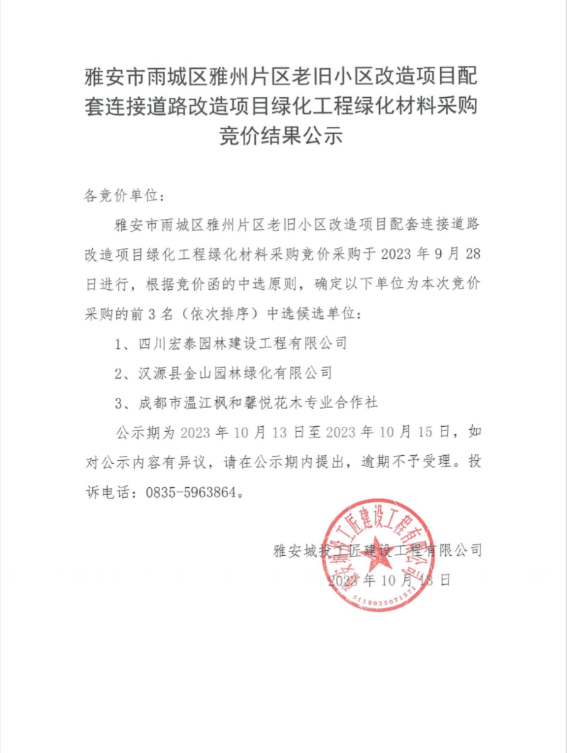 雅安市雨城區(qū)雅州片區(qū)老舊小區(qū)改造項目配套連接道路改造項目綠化工程綠化材料采購競價結果公示