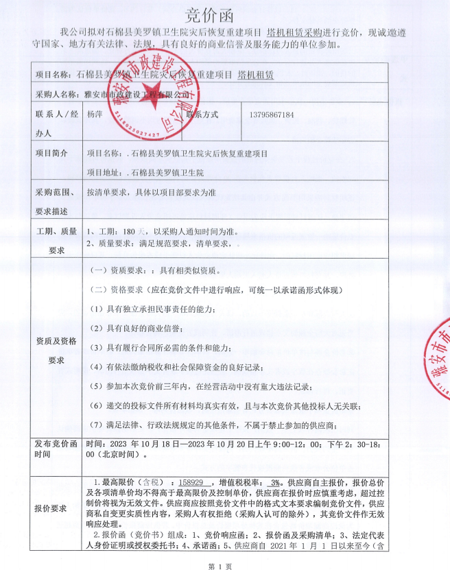 石棉縣美羅鎮(zhèn)衛(wèi)生院災后恢復重建項目塔機租賃采購競價公告
