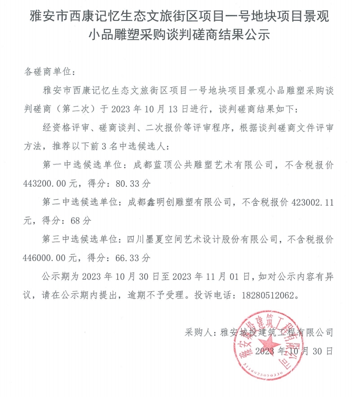 雅安市西康記憶生態(tài)文旅街區(qū)項(xiàng)目一號地塊項(xiàng)目景觀小品雕塑采購談判磋商結(jié)果公示