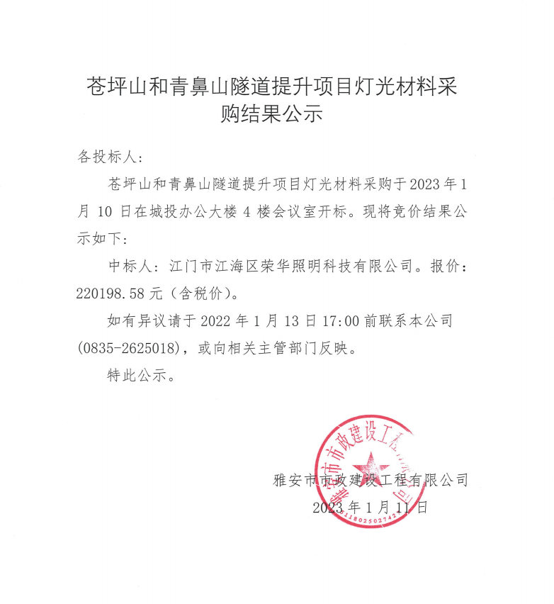 蒼坪山和青鼻山隧道提升項(xiàng)目燈光材料采購結(jié)果公示