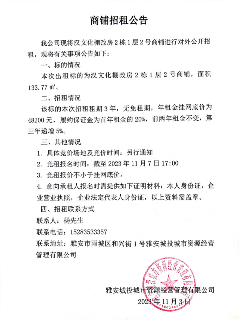 漢文化棚改房2棟1層2號商鋪招租公告