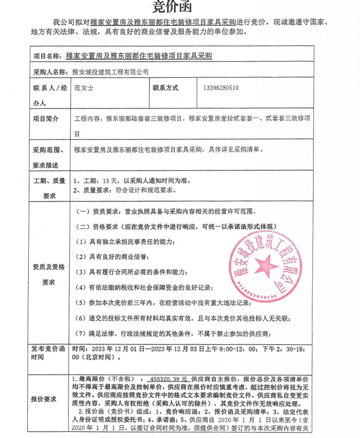 穆家安置房及雅東麗都住宅裝修項目家具采購競價公告