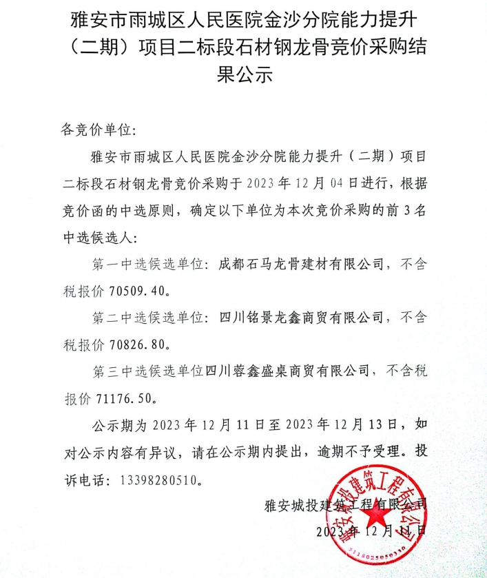 雅安市雨城區(qū)人民醫(yī)院金沙分院能力提升(二期)項(xiàng)目二標(biāo)段石材鋼龍骨采購競(jìng)價(jià)采購結(jié)果公示