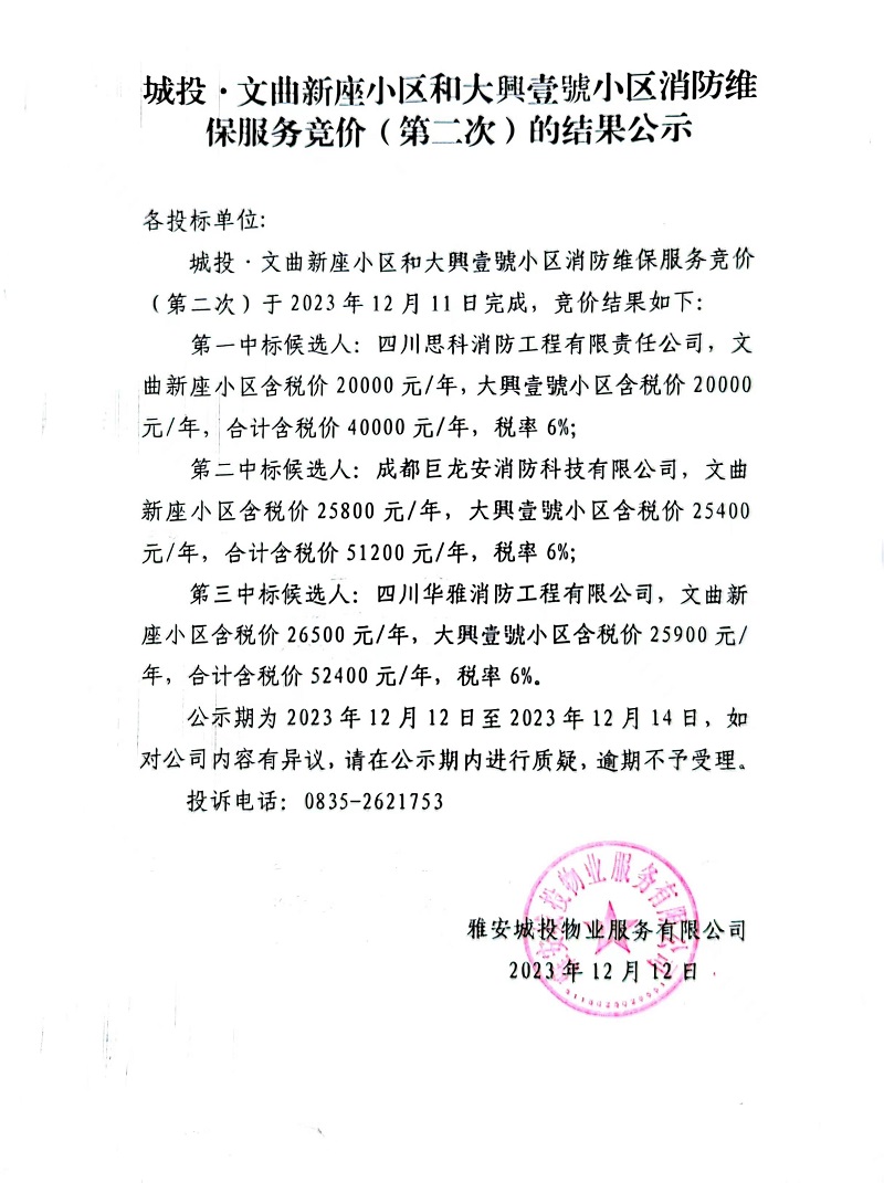 城投·文曲新座小區(qū)和大興壹號小區(qū)消防維保服務(wù)競價(第二次)的結(jié)果公示