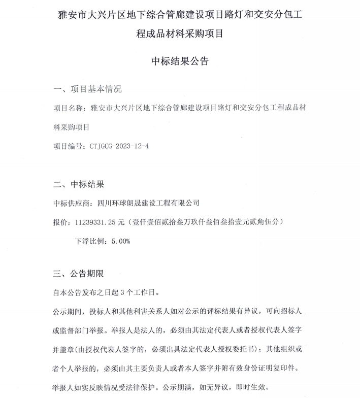 雅安市大興片區(qū)地下綜合管廊建設(shè)項目路燈和交安分包工程成品材料采購項目中標(biāo)結(jié)果公告
