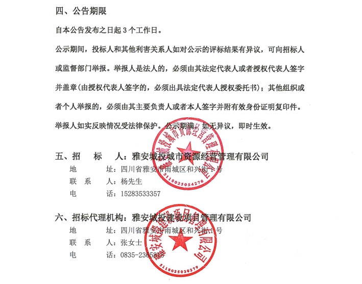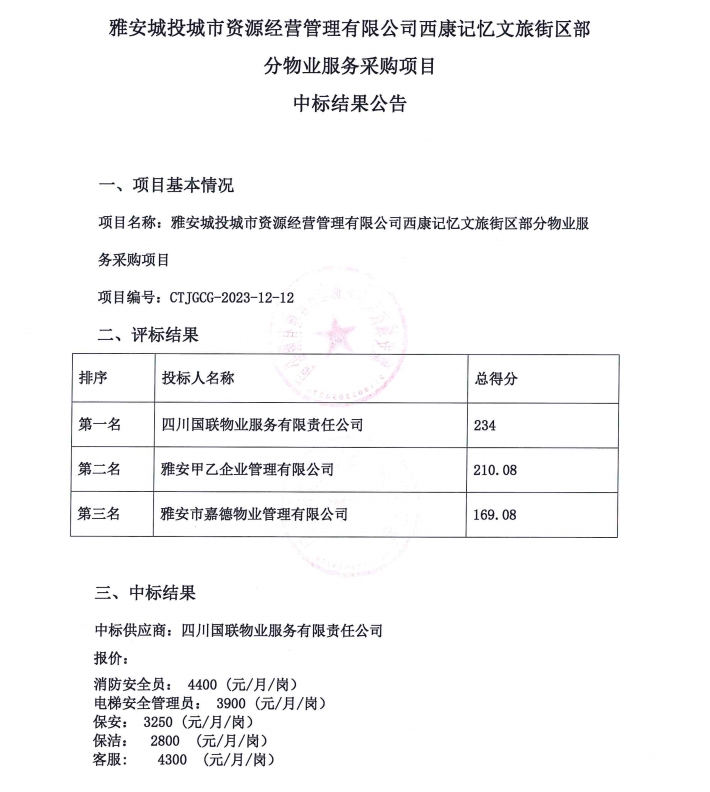 雅安城投城市資源經(jīng)營管理有限公司西康記憶文旅街區(qū)部分物業(yè)服務采購項目中標結果公告