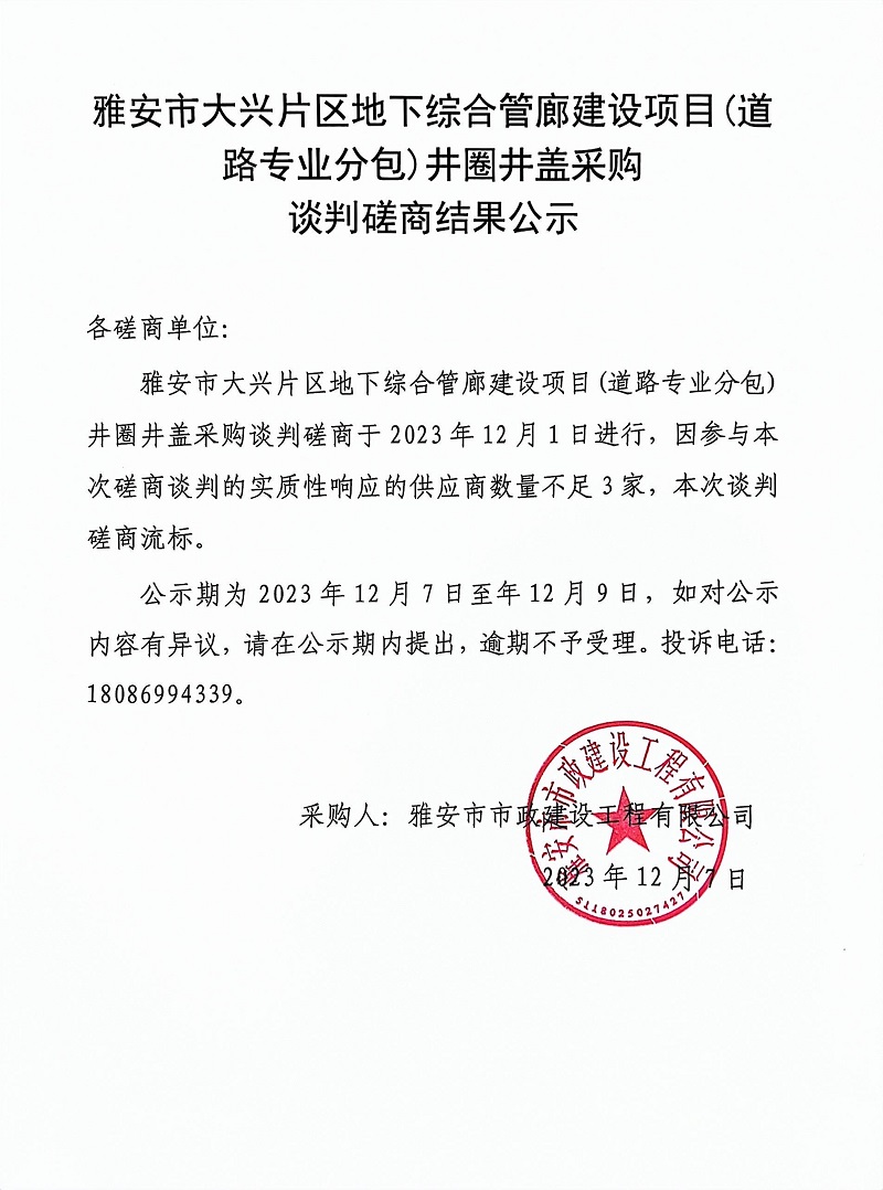 雅安市大興片區(qū)地下綜合管廊建設(shè)項(xiàng)目(道路專業(yè)分包)井圈井蓋采購(gòu)談判磋商結(jié)果公示