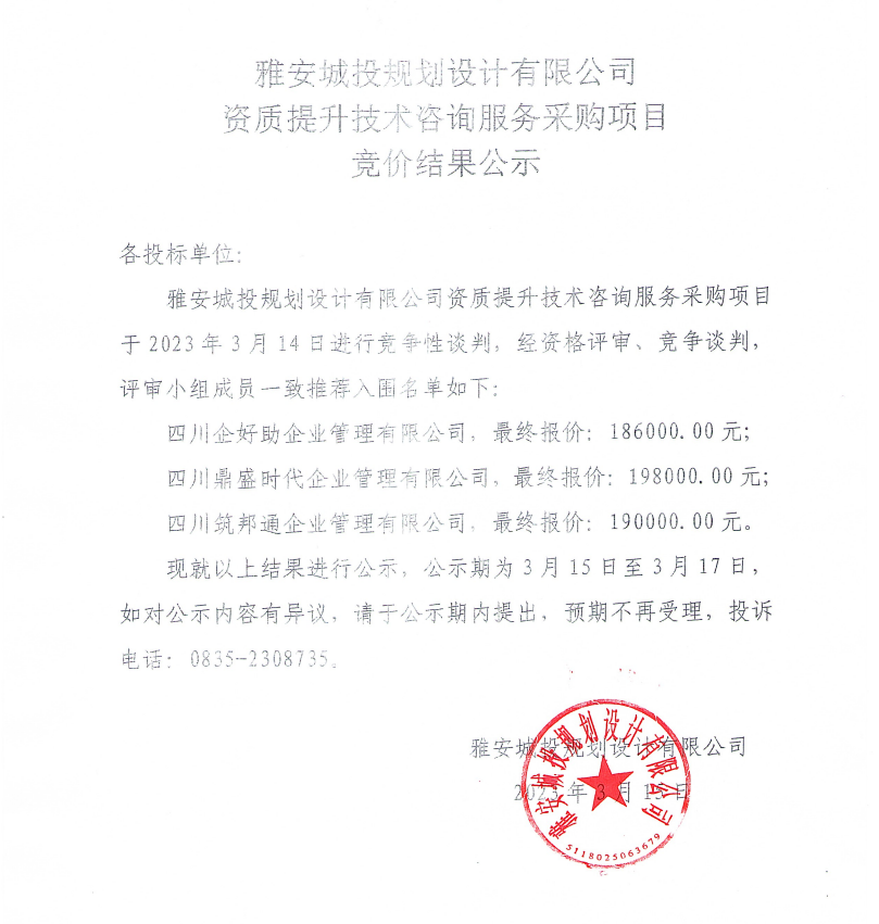 雅安城投規(guī)劃設(shè)計(jì)有限公司資質(zhì)提升技術(shù)咨詢服務(wù)采購項(xiàng)目競價(jià)結(jié)果公示