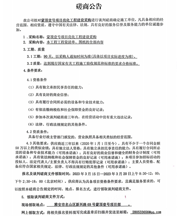 蒙頂壹號項(xiàng)目亮化工程建設(shè)采購磋商公告