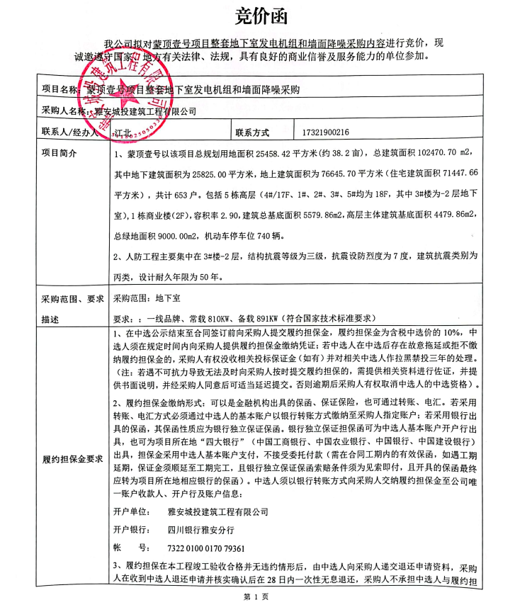 蒙頂壹號項(xiàng)目整套地下室發(fā)電機(jī)組和墻面降噪采購競價(jià)公告