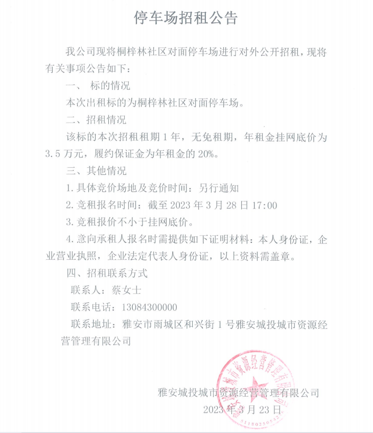 桐梓林社區(qū)對(duì)面停車(chē)場(chǎng)招租公告
