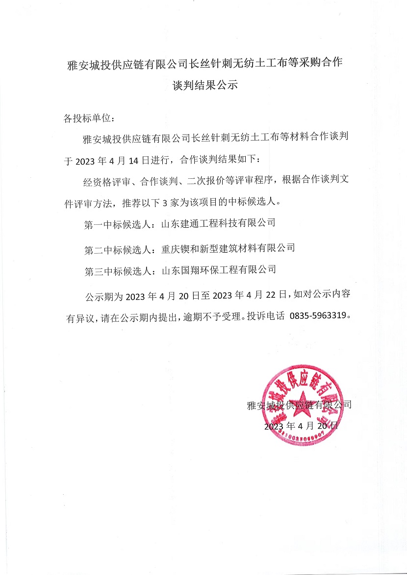 雅安城投供應(yīng)鏈有限公司長(zhǎng)絲針刺無(wú)紡?fù)凉げ嫉炔少?gòu)合作談判結(jié)果公示