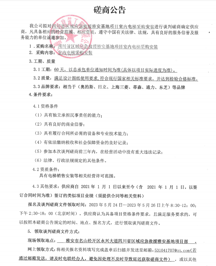 四川省區(qū)域應(yīng)急救援雅安基地項目室內(nèi)電梯采購安裝談判磋商公告