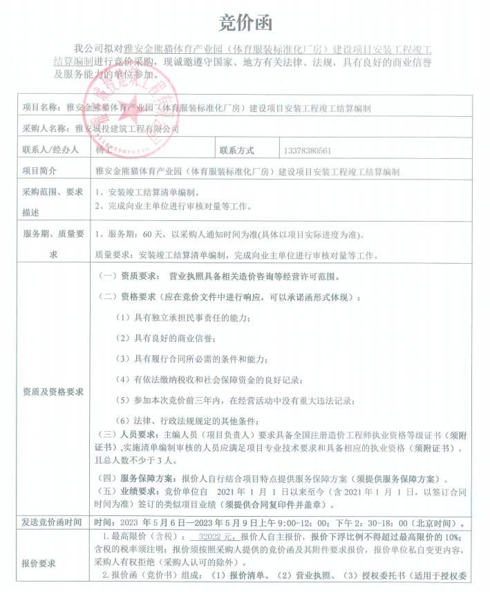 雅安金熊貓?bào)w育產(chǎn)業(yè)園(體育服裝標(biāo)準(zhǔn)化廠(chǎng)房)建設(shè)項(xiàng)目安裝工程竣工結(jié)算編制競(jìng)價(jià)公告