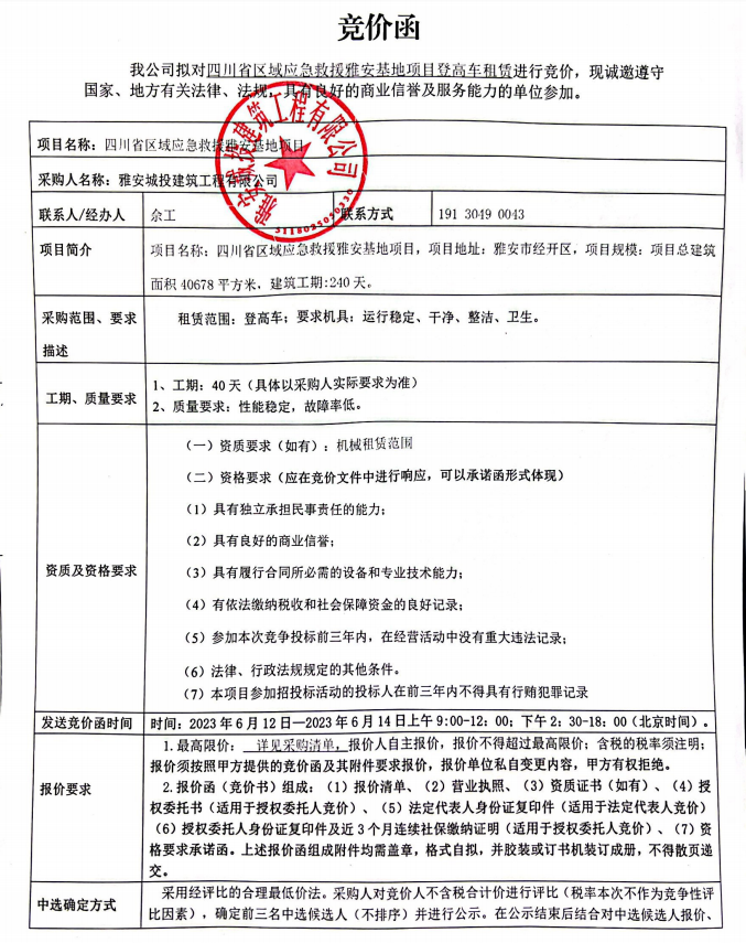 四川省區(qū)域應急救援雅安基地項目登高車租賃競價公告