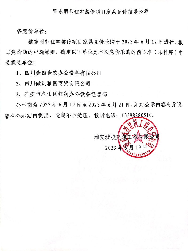 雅東麗都住宅裝修項目家具競價結(jié)果公示