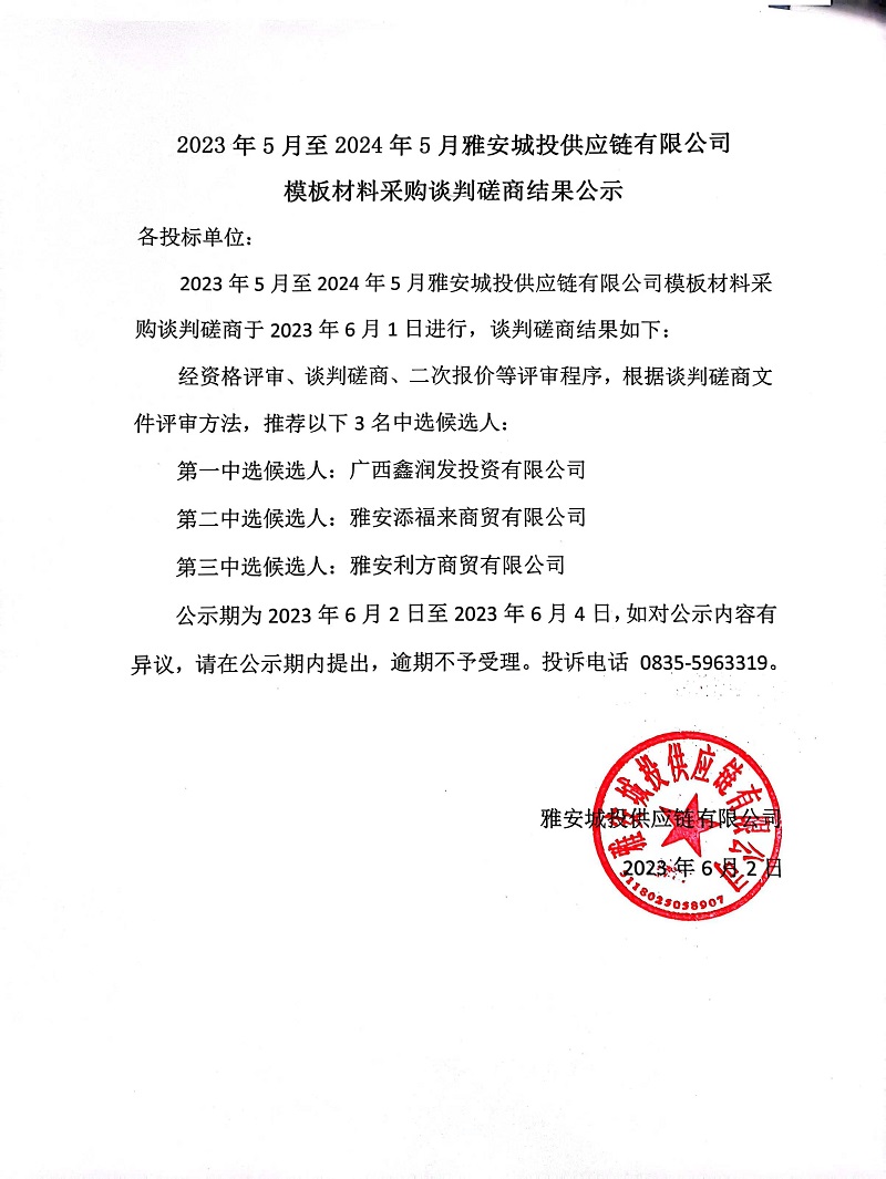 2203年5月至2024年5月雅安城投供應鏈有限公司模板材料采購談判磋商結(jié)果公示