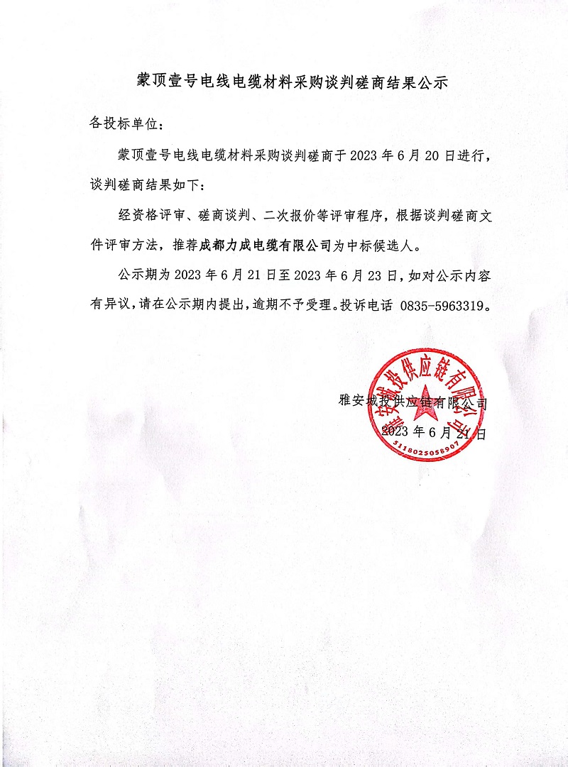 蒙頂壹號電線電纜材料采購談判磋商結(jié)果公示