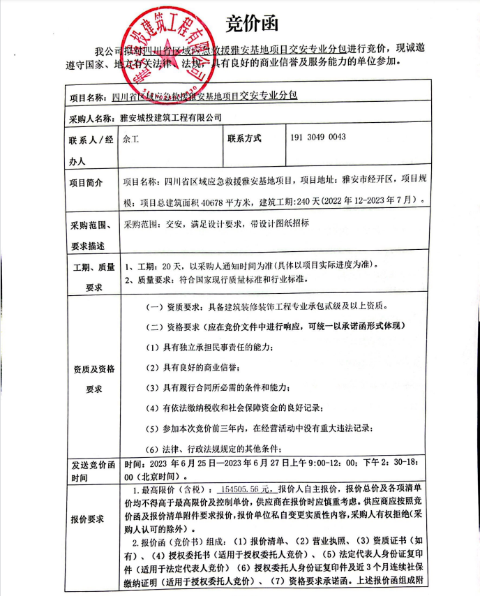 四川省區(qū)域應(yīng)急救援雅安基地項(xiàng)目交安專(zhuān)業(yè)分包競(jìng)價(jià)公告