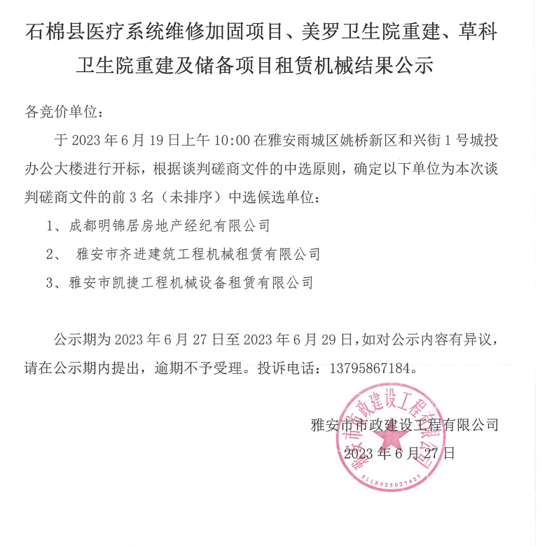 石棉縣醫(yī)療系統(tǒng)維修加固項目、美羅衛(wèi)生院重建、草科衛(wèi)生院重建及儲備項目租賃機械結(jié)果公示