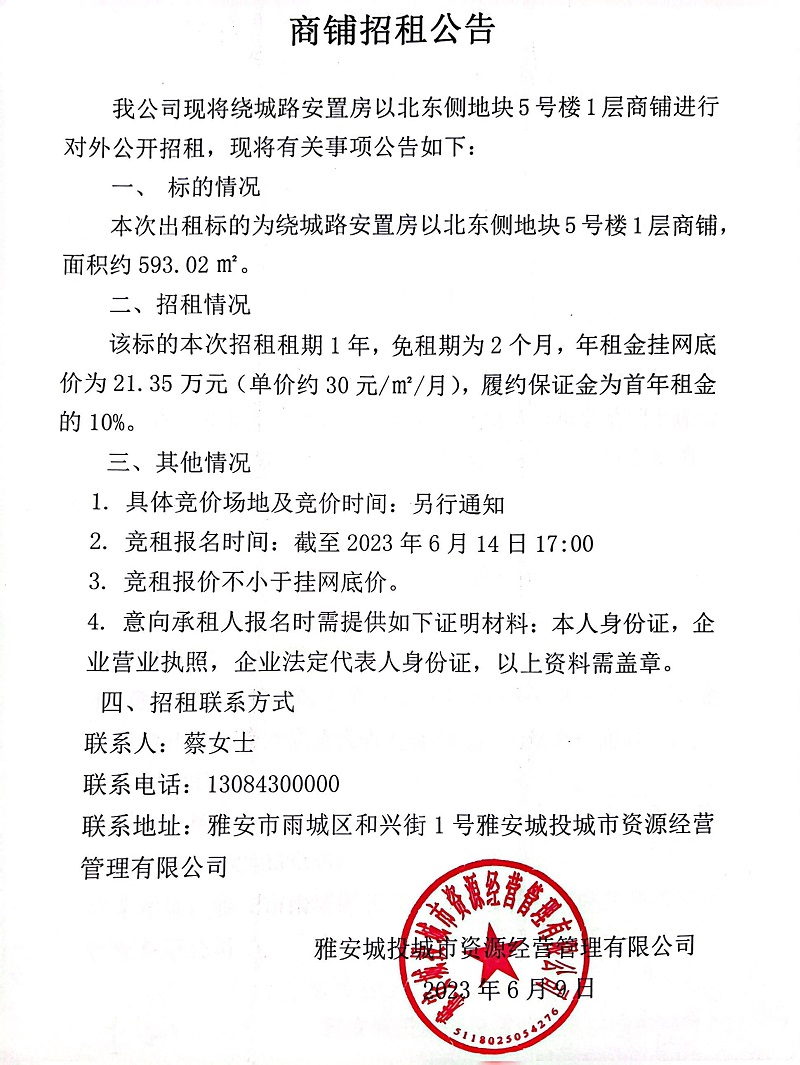 繞城路安置房以北東側(cè)地塊5號樓1層商鋪招租公告