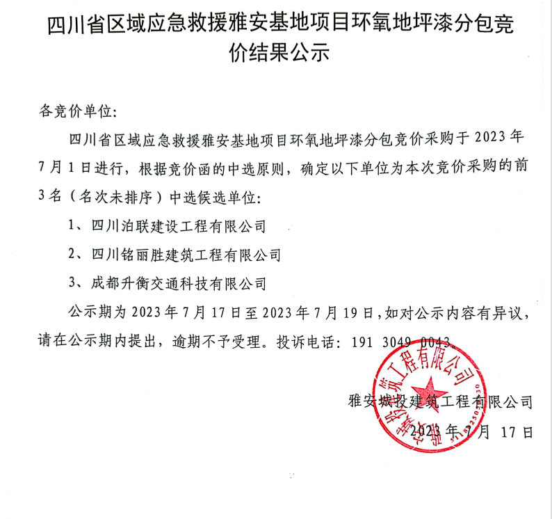 四川省區(qū)域應(yīng)急救援雅安基地項目環(huán)氧地坪漆分包競價結(jié)果公示