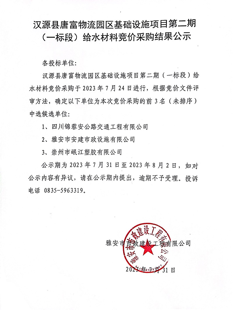 漢源縣唐富物流園區(qū)基礎(chǔ)設(shè)施項目第二期(一標段)給水材料競價采購結(jié)果公示