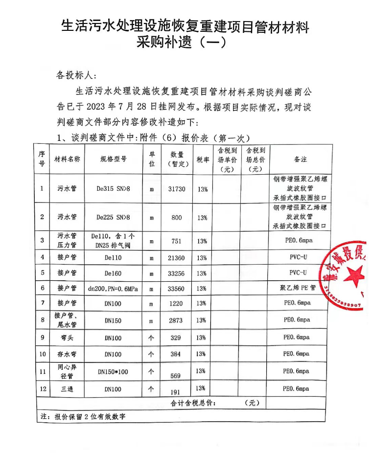 生活污水處理設施恢復重建項目管材材料采購補遺(一)
