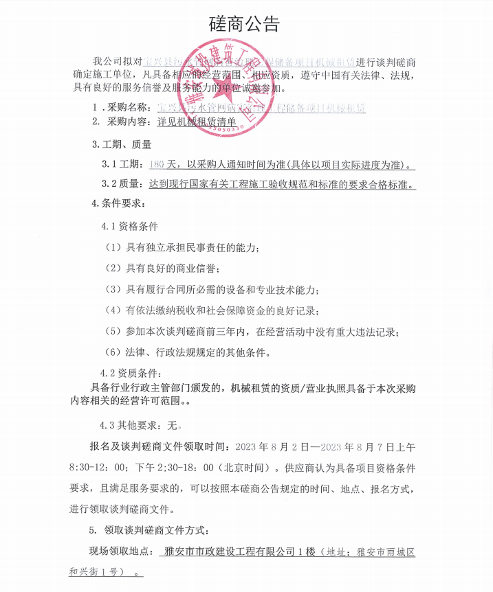 寶興縣污水管網病害治理工程儲備項目機械租賃談判磋商公告