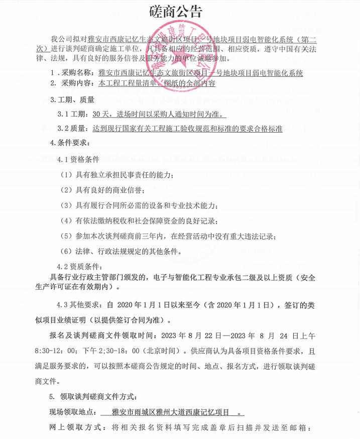 雅安市西康記憶生態(tài)文旅街區(qū)項(xiàng)目一號(hào)地塊項(xiàng)目弱電智能化系統(tǒng)(第二次)談判磋商公告