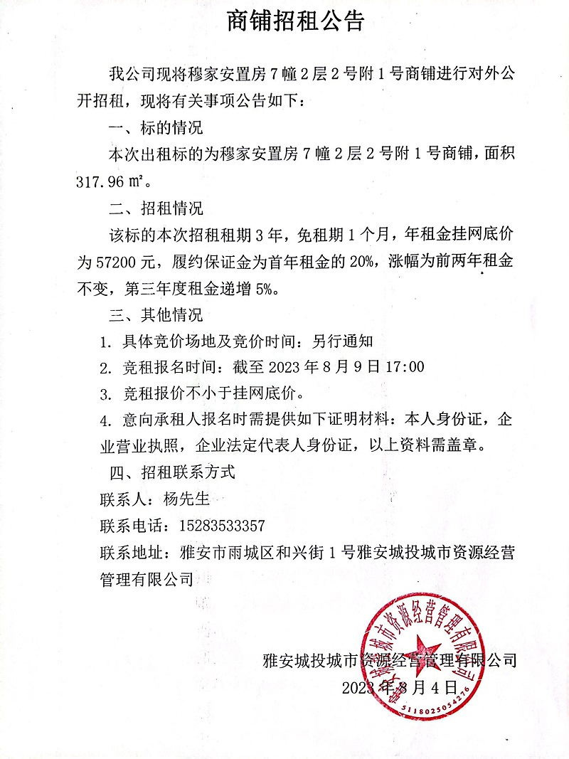 穆家安置房7幢2層附1號(hào)商鋪招租公告