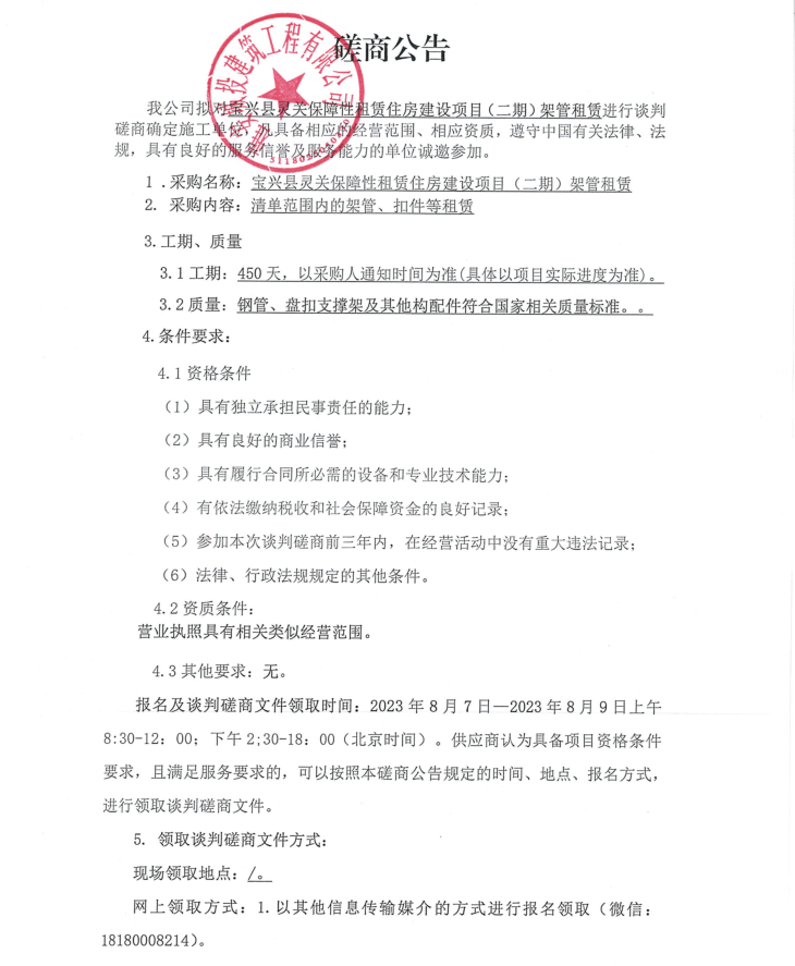 寶興縣靈關(guān)保障性租賃住房建設(shè)項(xiàng)目(二期)架管租賃談判磋商公告
