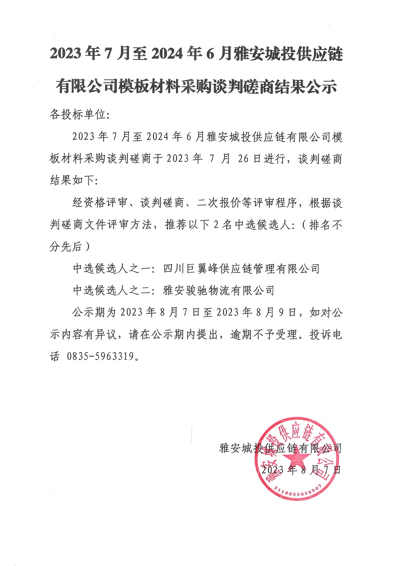2023年7月至2024年6月雅安城投供應(yīng)鏈有限公司模板材料采購(gòu)談判磋商結(jié)果公示