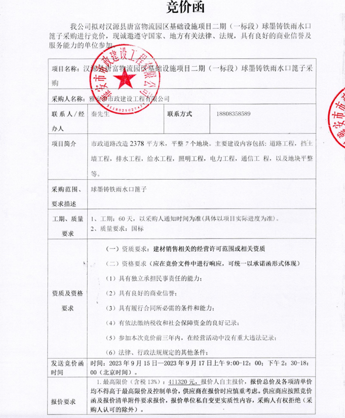 漢源縣唐富物流園區(qū)基礎設施項目二期(一標段)球墨鑄鐵雨水口篦子采購競價公告