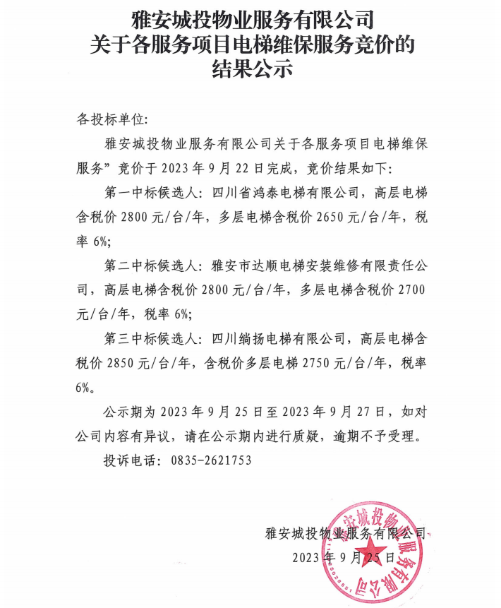 雅安城投物業(yè)服務(wù)有限公司關(guān)于各服務(wù)項(xiàng)目電梯維保服務(wù)競(jìng)價(jià)的結(jié)果公示
