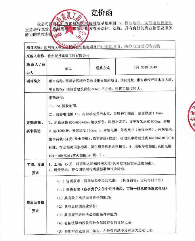 四川省區(qū)域應(yīng)急救援雅安基地項(xiàng)目PVC橡膠地面、防靜電地板采購安裝競價公告