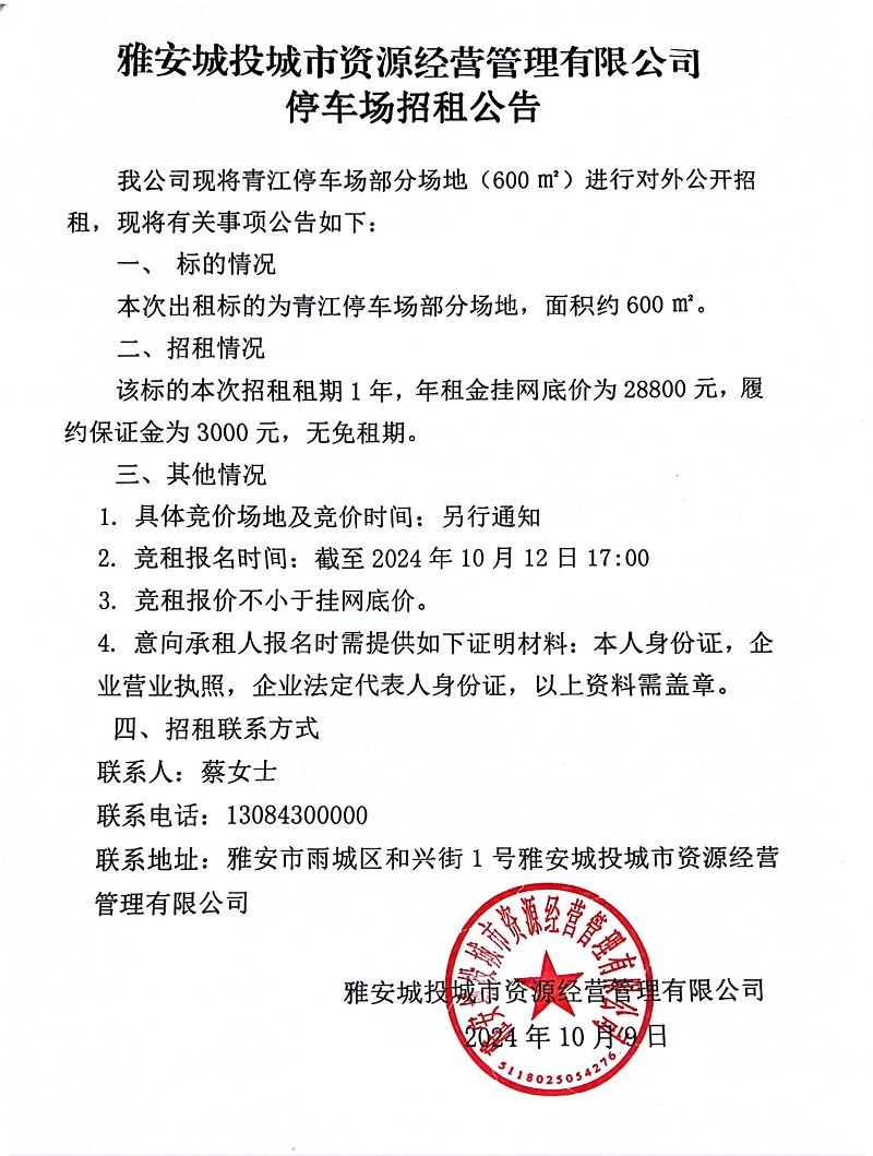 雅安城投城市資源經營管理有限公司關于青江停車場部分場地招租的公告