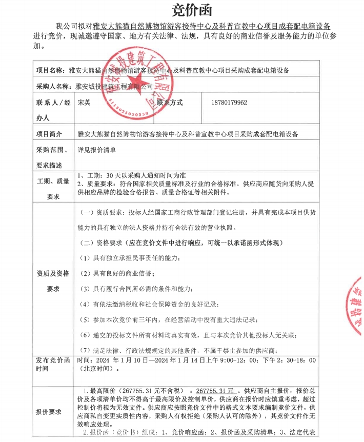 雅安大熊貓自然博物館游客接待中心及科普宣教中心項目成套配電箱設備競價公告