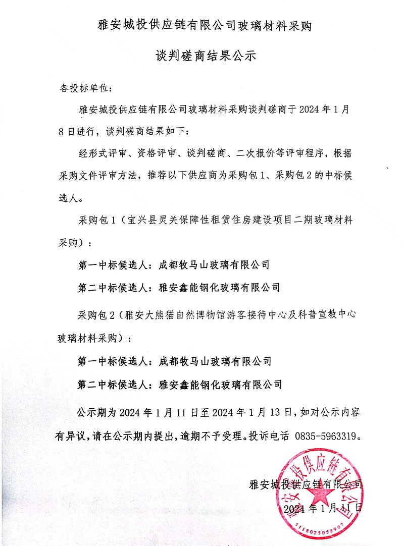 雅安城投供應(yīng)鏈有限公司玻璃材料采購(gòu)談判磋商結(jié)果公示