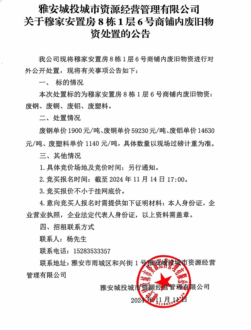 雅安城投城市資源經(jīng)營管理有限公司關于穆家安置房8棟1層6號商鋪內(nèi)廢舊物資處置的公告公告