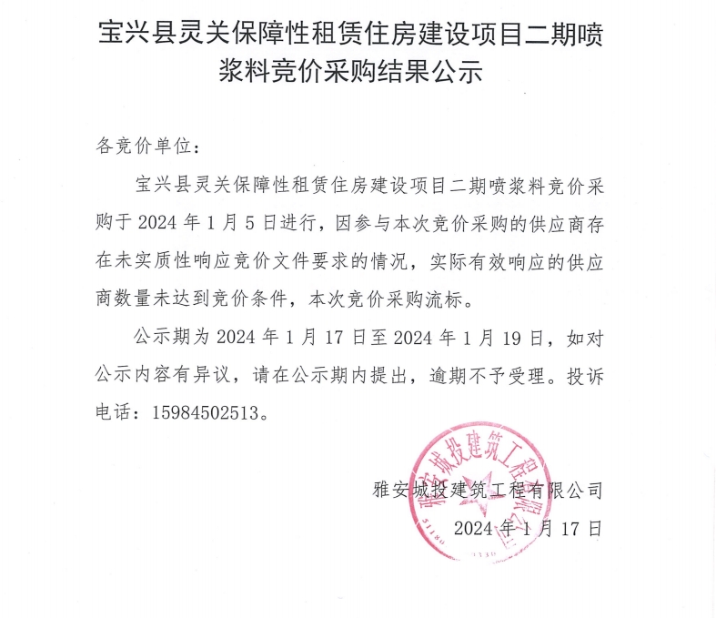 寶興縣靈關保障性租賃住房建設項目二期噴漿料競價采購結(jié)果公示