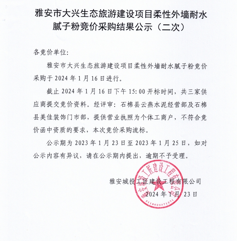 雅安市大興生態(tài)旅游建設(shè)項(xiàng)目柔性外墻耐水膩?zhàn)臃鄹們r(jià)采購(第二次)結(jié)果公示