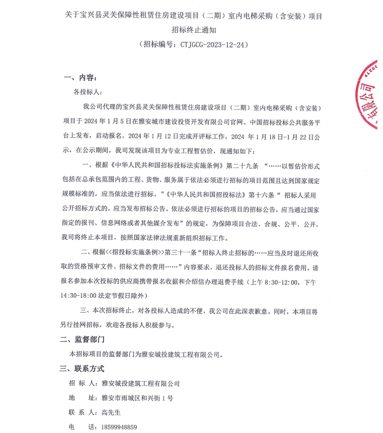 關于寶興縣靈關保障性租賃住房建設項目(二期)室內(nèi)電梯采購(含安裝)項目招標終止通知