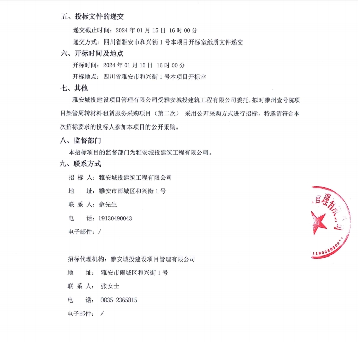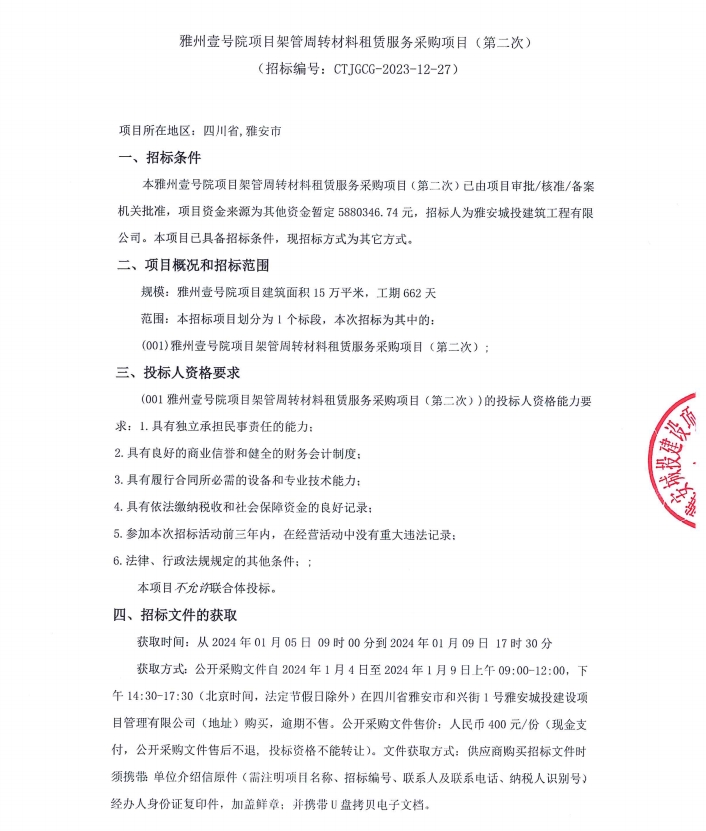 雅州壹號(hào)院項(xiàng)目架管周轉(zhuǎn)材料租賃服務(wù)采購(gòu)項(xiàng)目(第二次)公告