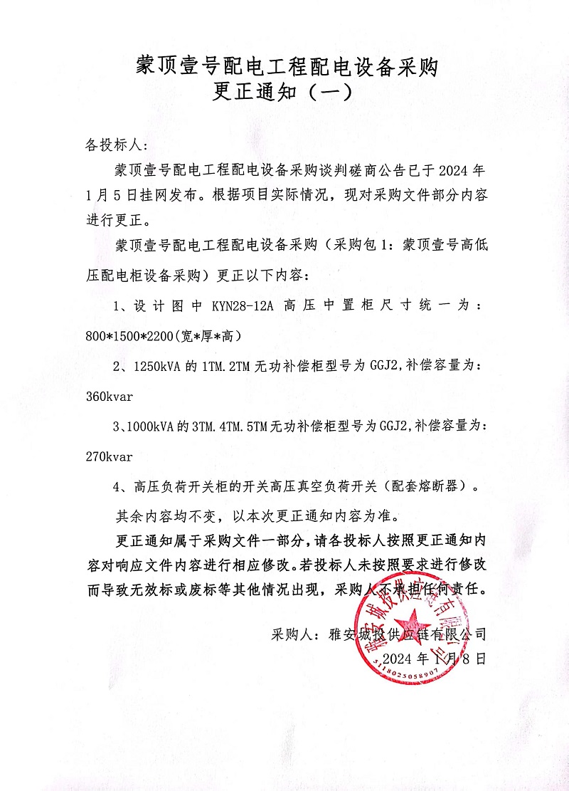 蒙頂壹號配電工程配電設備采購更正通知(一)