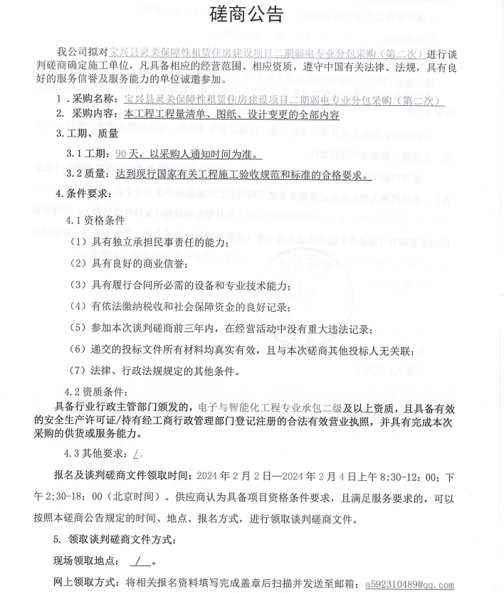 寶興縣靈關(guān)保障性租賃住房建設(shè)項目二期弱電專業(yè)分包采購(第二次)談判磋商公告