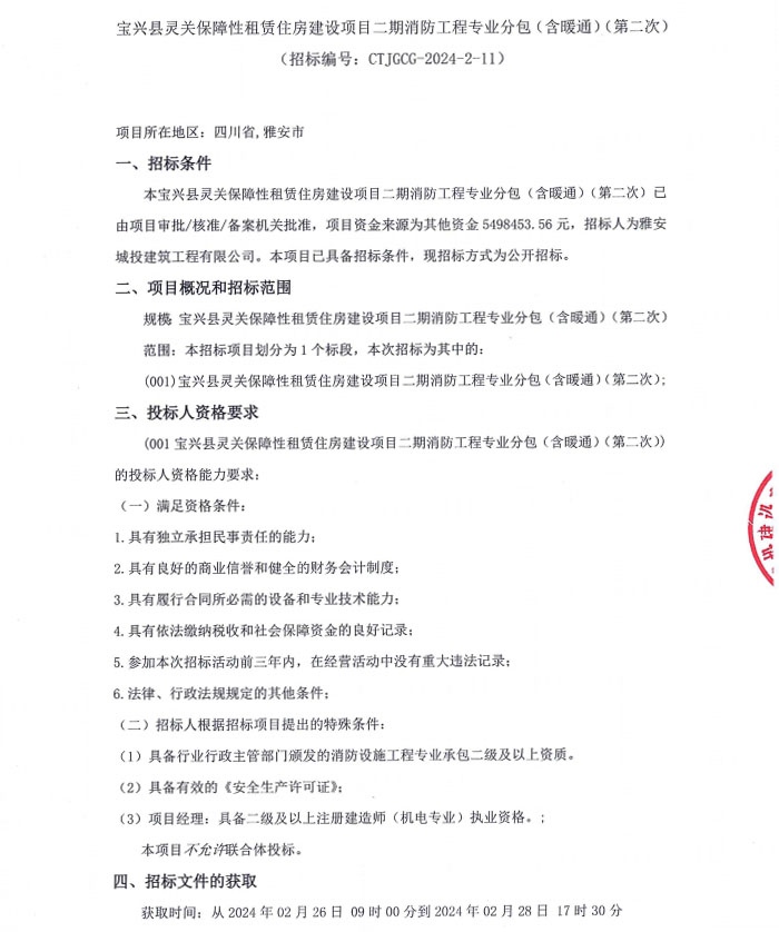 寶興縣靈關(guān)保障性租賃住房建設(shè)項目二期消防工程專業(yè)分包(含暖通)(第二次)公告